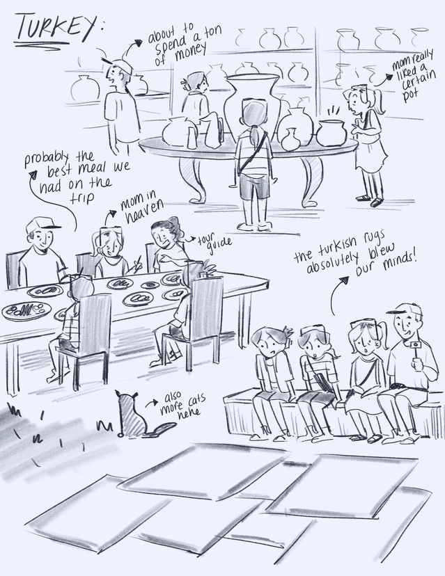 Memory Sketches of Europe is a zine inspired by a family trip to Europe in the summer of 2023. During our travels through Italy, Croatia, Turkey, and Greece, I made countless cherished memories with my family. This zine serves as a way to capture and preserve some of those moments—the laughter, the adventures, and the little joys. The original zine was printed as a risograph, with the images below serving as the print files.
